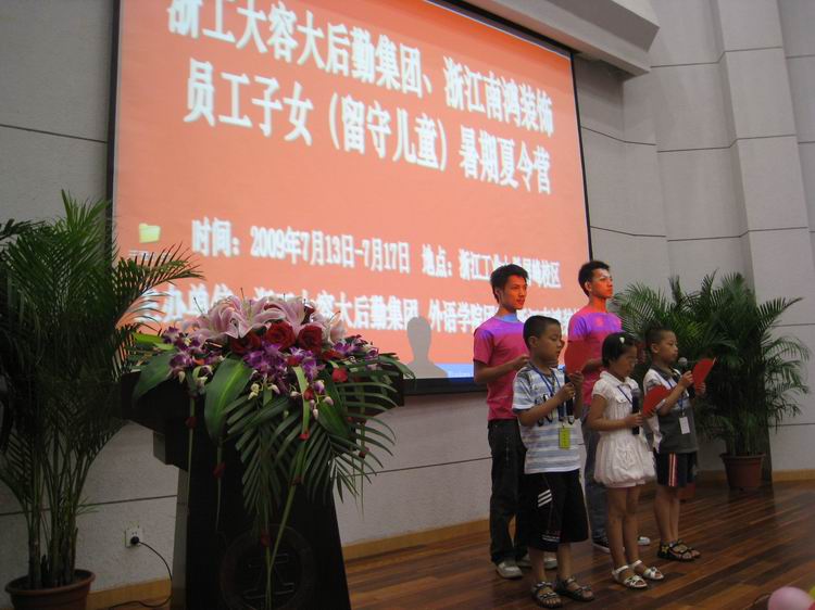 在開營儀式上,留守兒童代表以詩歌朗誦的形式道出了他們幼小心靈的共同心聲,長期的兩地分離,與一起在家鄉生活的長輩的疏于交流,令他們常常有著難以言說的不合年紀的憂郁,而社會各界也逐漸越來越關注這個問題,”所以,這僅僅是個開始,我們要堅定不移地走下去.南鴻裝飾的副總陳玲就在發言中表明了知名企業在該問題上的態度.”企業的發展離不開社會的關懷,而企業能夠發展至今,其實回報社會的想法醞釀已久,但苦于沒有契機,這次浙工大后勤集團的夏令營無疑讓我們企業尋求到了回報社會的契機,今后,浙工大的此類活動,我們都將進行無條件的支持和贊助,并且,我們還要呼吁更多的業內外企業參與進來,共同營造和諧的社會氛圍.