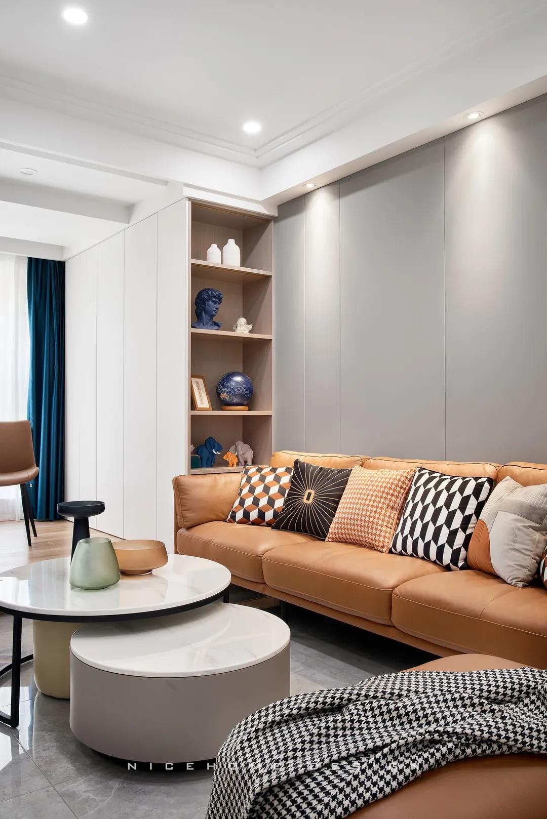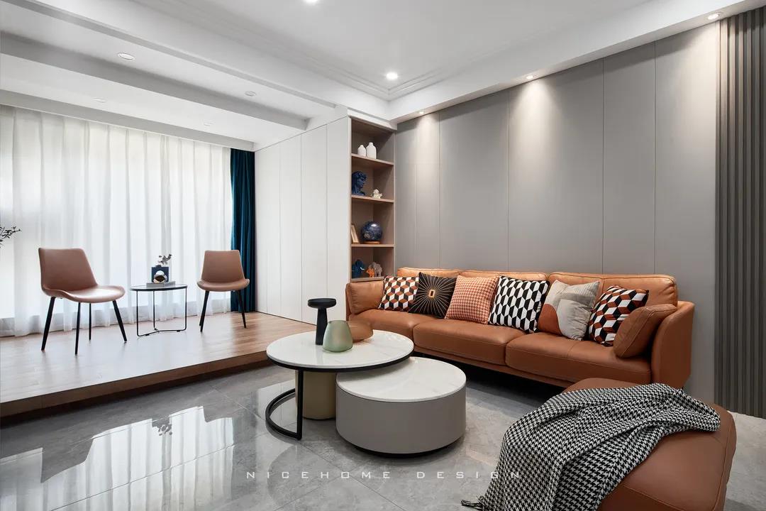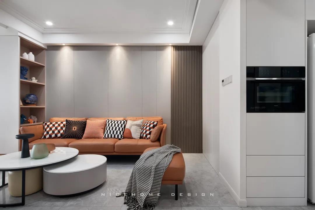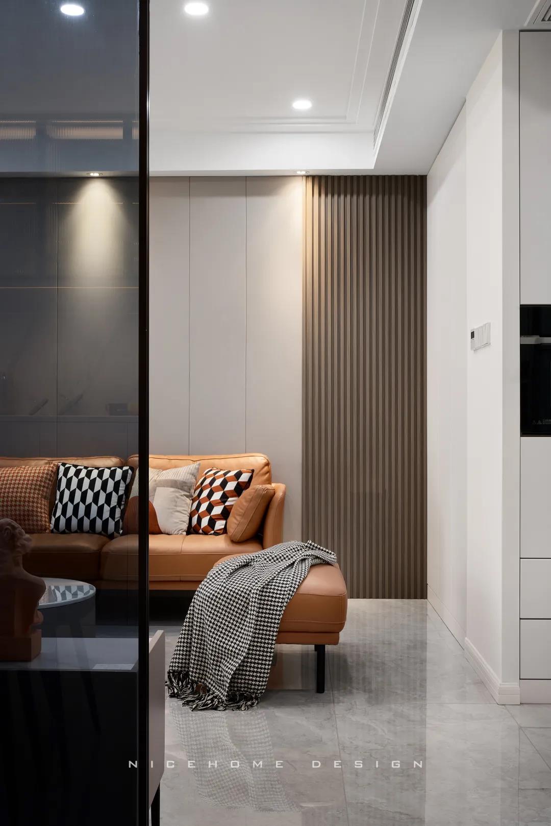 沙發背景墻以咖色皮質硬包組合木格柵,搭配上“熱情”的赭色沙發,軟硬材質、冷暖色調的和諧配比,構建簡單溫暖的舒適居住環境。