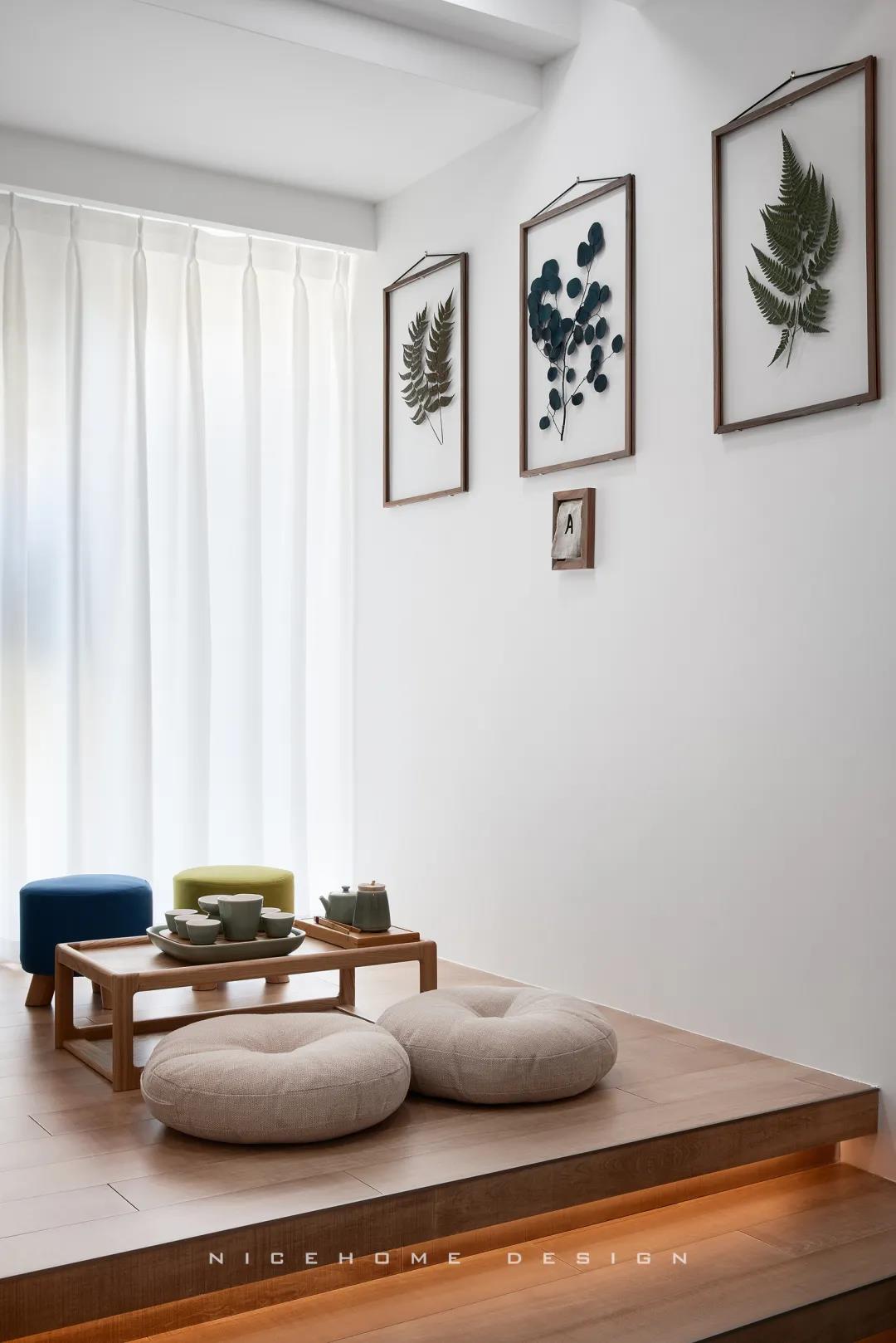 餐廳陽臺同樣包進改造為了茶室,雙層木質地臺抬高,以茶會友,快樂翻倍!